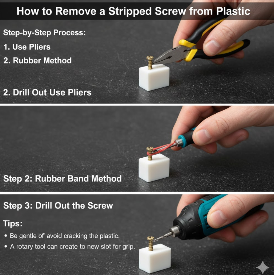 Stripped screws in plastic require a delicate approach because the material can easily crack or break. Here’s how to handle this situation: