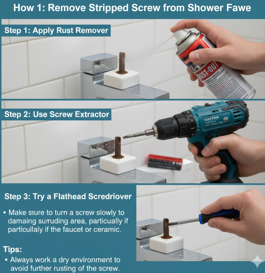 Dealing with a stripped screw in a shower faucet requires patience, especially because water exposure can lead to rust and corrosion. Here’s what you can do: