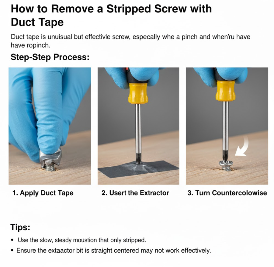 Duct tape is an unusual but effective way to remove a stripped screw, especially when you’re in a pinch and don’t have specialized tools.