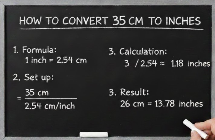 Q2: What is the formula for converting 35 cm to inches? The formula is: Inches = Centimeters ÷ 2.54. So, for 35 cm, it would be 35 ÷ 2.54 ≈ 13.78 inches.