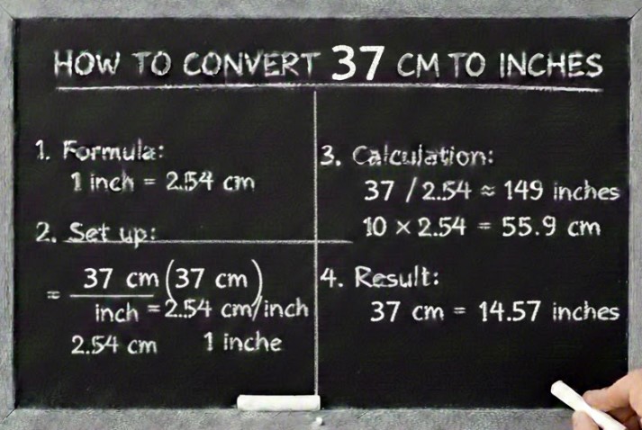 - How do I convert centimeters to inches manually? To convert cm to inches, divide the number of centimeters by 2.54. For example, 37 cm ÷ 2.54 = 14.57 inches.