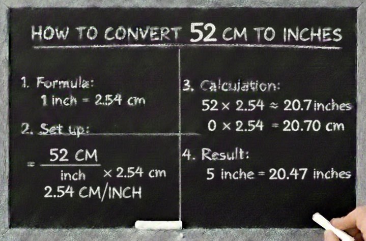 Let’s walk through the process of converting 52 cm to inches step by step. To make this simple, we’ll use the conversion factor of 0.393701:52cm×0.393701=20.4725inches