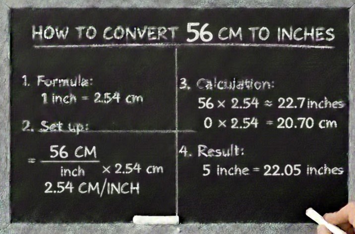 Now, let’s convert 56 cm to inches using this formula: 56 cm ÷ 2.54 = 22.05 inches.