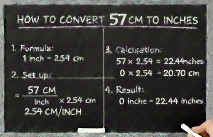 To convert 57 cm to inches, you simply divide the number of centimeters by 2.54: